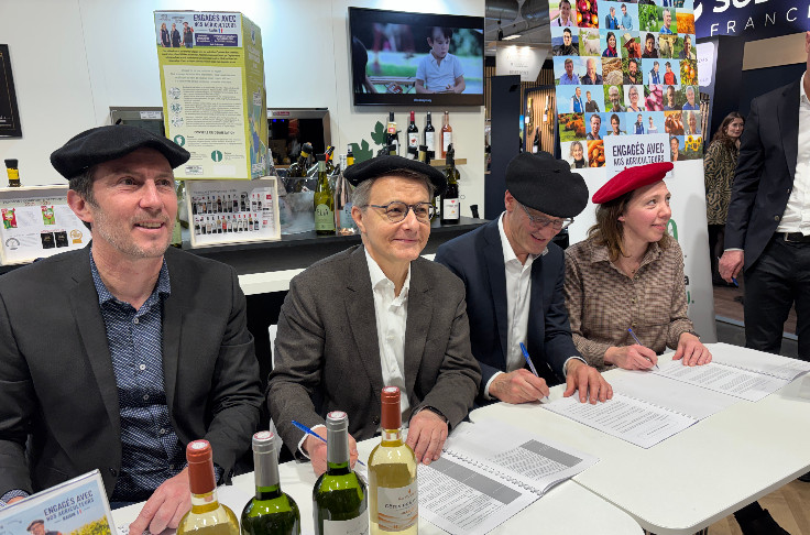 Avec cet accord signé sur Wine Paris avec le distributeur, 7 000 hl produits par des adhérents de l’union coopérative gersoise seront rémunérés avec une surprime pour apporter de la stabilité et de la visibilité pendant 3 ans, en contrepartie d’un cahier des charges de production spécifique en agriculture du vivant. S urprime de 200 €/ha sur 7 000 hl produits par 9 vignerons adhérents de la cave gersoise de Plaimont, « et ce pour seulement quelques centimes en plus sur le prix de vente par bouteille », appuie le directeur général de Plaimont, Olivier Boudet-Pees. Voilà en substance le socle du partenariat tripartite signé ce 10 février lors de Wine Paris entre Coopérative U et Plaimont, visant à appuyer [...] Voir l'article complet sur VitiSphere