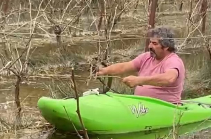 Taille en kayak pour ce viticulteur s’adaptant aux pluies diluviennes